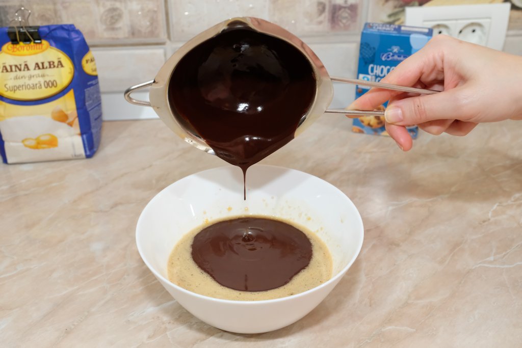 Într-un castron mediu, bate ouăle cu un praf de sare și esența de rom. Adaugă zahărul, untul topit și ciocolata topită, amestecând până obții o compoziție omogenă.