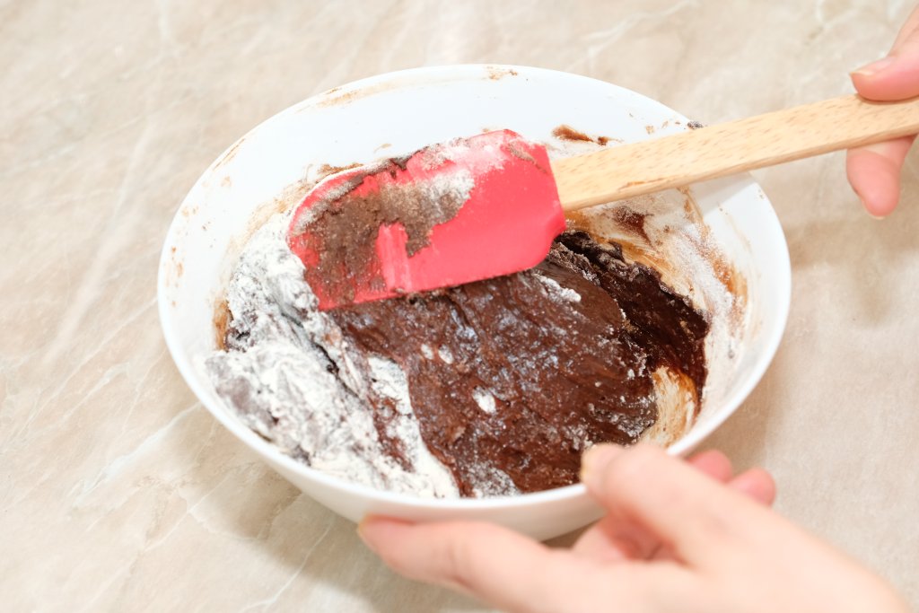 Cerne cacaoa și făina, apoi încorporează-le treptat în amestec. Nu mixa excesiv, pentru a păstra textura fondantă. La final, adaugă bucățile de ciocolată pentru un plus de savoare.